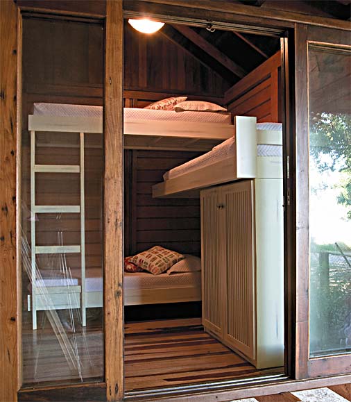 1. Telhado. Com 60% de inclinação e 16 águas, é composto de vigamento, ripamento, manta isolante, telhas portuguesas e forro de itaúba. 2. Paredes. Cada peça de garapeira (15 x 130 x 3,50 cm) foi encaixada em montantes de 14 x 14 cm. Nas bases, a fixação se dá por meio do peso do próprio conjunto. 3. Piso interno. A casa fica suspensa do solo, apoiada em barrotes de garapeira de 14 x 14 cm. O piso de muiracatiara foi instalado por encaixe macho e fêmea. 4. Fundação. Constituída de sapatas de concreto armado. 5. Hidráulica e elétrica. Por estar suspensa, a construção concentra sob ela as instalações hidráulicas e elétricas, facilitando a manutenção. 6. Deque. A superfície de itaúba foi lixada e, posteriormente, protegida com verniz impregnante (Sparlack Cetol Deck, da Akzo Nobel).